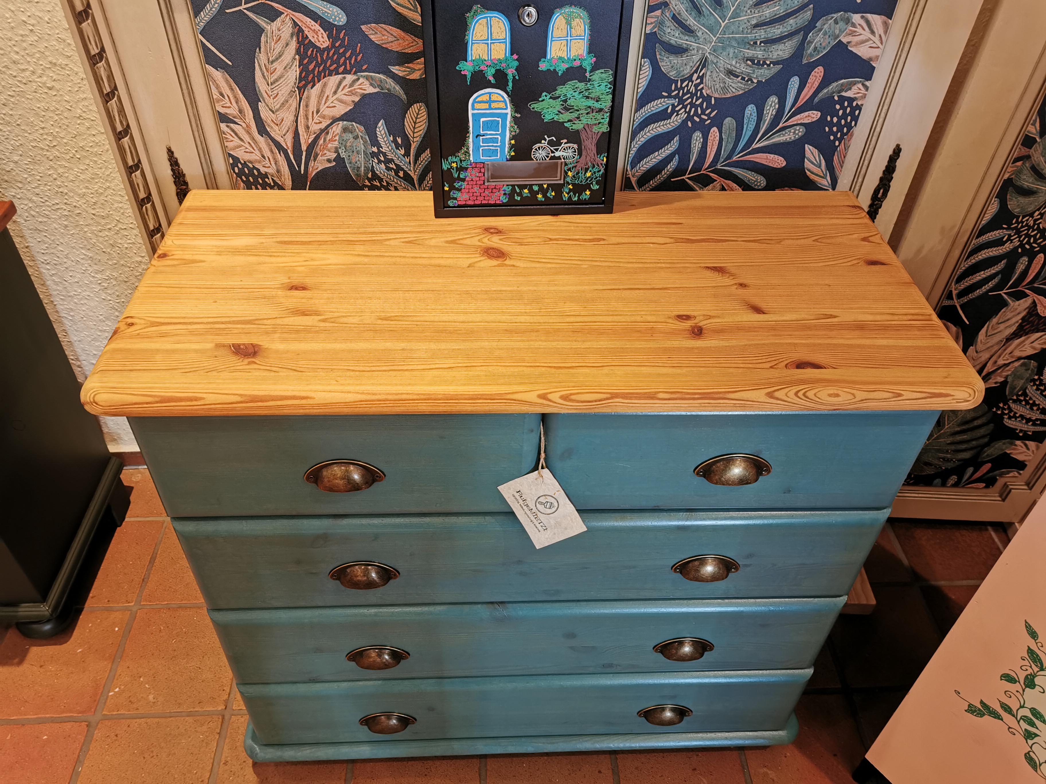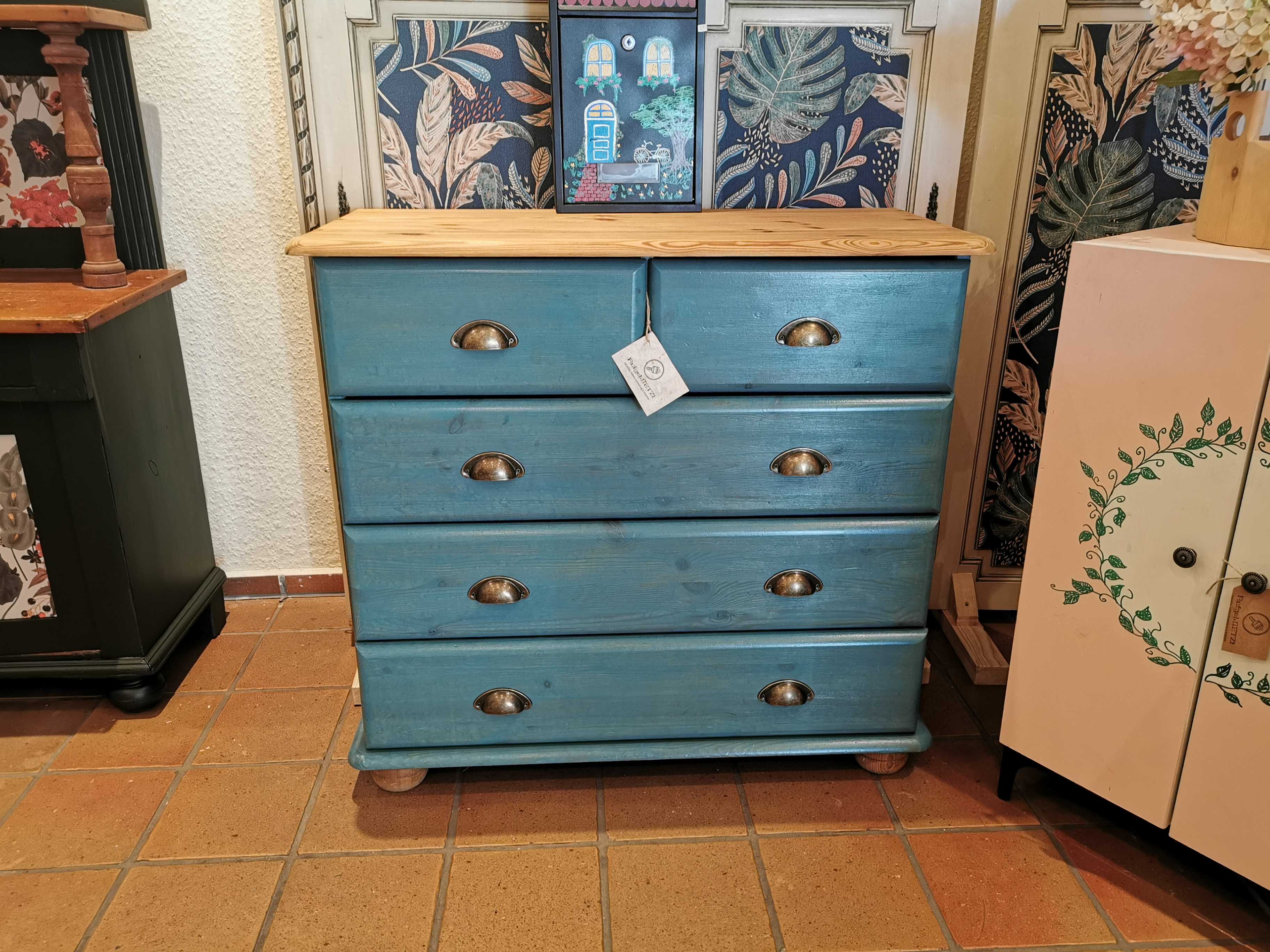 Kalle ist und war ein hübscher, maritim anmutender Schrank. Eine ähnliche Lasur war bereits vorhanden. Da wir den Farbton sehr ansprechend fanden, haben wir ihm diesen erneut gegeben und die neue Lasur mehrschichtig aufgetragen. Zusätzlich hat er neue Griffe im Apotheker-Stil erhalten. Die Maße lauten wie folgt: 79 cm x 39 cm x 85 cm (HxTxB). Zu haben ist er für 350,00 €. |