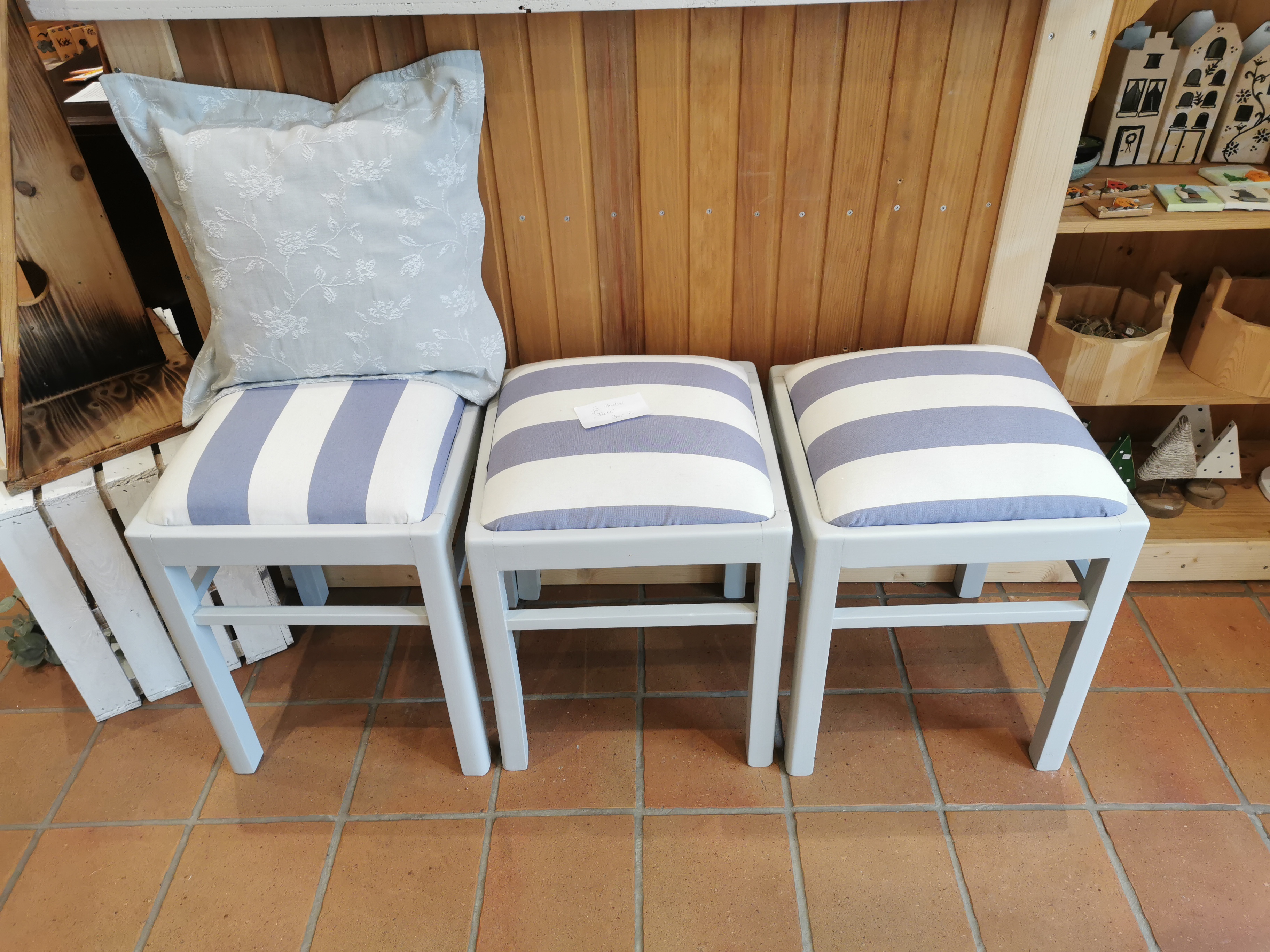 Die 3 von der Tanke - jeweils "Fiete" genannt - kommen aus einer Gartenlaube. Sie haben einen lichtgrauen Anstrich und neue Sitzbezüge erhalten.
